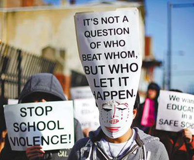 這起事件2009年12月初發(fā)生在南費(fèi)城高中(South Philadelphia High School),一群非裔學(xué)生毆打亞裔學(xué)生,近30名亞裔學(xué)生受傷,當(dāng)中幾人還送醫(yī)治療。除了學(xué)生罷課,家長以及當(dāng)?shù)貋喴嵘鐓^(qū)也都發(fā)動了大規(guī)模抗議,整起事件愈演愈烈。費(fèi)城教育當(dāng)局受到各方壓力,事后召開了公聽會,宣布成立調(diào)查小組,展開全面調(diào)查。費(fèi)城教育局長則承諾增加雙語輔導(dǎo)人員,通過社區(qū)的力量化解沖突。目前,10名涉案學(xué)生已遭退學(xué)。
