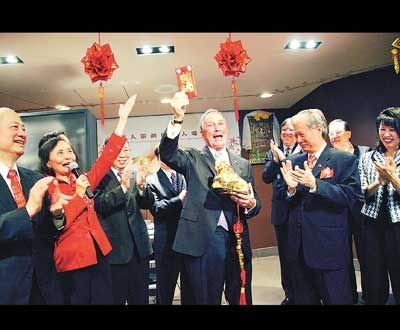 中新網(wǎng)2月25日電 據(jù)美國(guó)《僑報(bào)》報(bào)道,紐約市長(zhǎng)彭博23日來到華策會(huì)人瑞中心,向華裔耆老拜年。人瑞中心主任伍寶玲按華人過年傳統(tǒng)給彭博送上仿真金馬、金虎和紅包,彭博喜笑顏開,開心地摸著虎頭,希望給紐約帶來好運(yùn)。