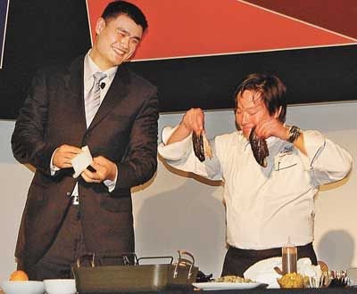 晚宴中最搞笑的節(jié)目莫過(guò)于華裔名廚蔡明昊教姚明制作北京烤鴨。蔡明昊不愧為艾美獎(jiǎng)得主,烹飪的過(guò)程中妙語(yǔ)連珠,連平日口才不錯(cuò)的姚明都“抖”不出這么多“包袱”。
