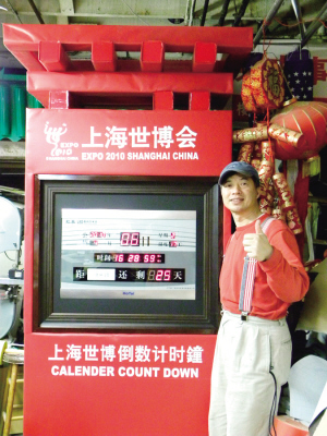 黃漢龍介紹他制作的上海世博會(huì)倒計(jì)時(shí)鐘,將擺放在舊金山灣區(qū)佛利蒙永和超市前,讓灣區(qū)僑胞也能一起為上海世博倒計(jì)時(shí)并迎接上海世博會(huì)的到來(lái)。