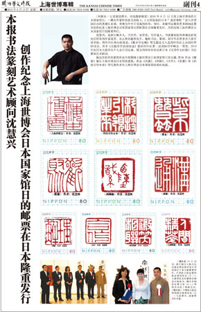 中新網(wǎng)6月12日電 據(jù)日本《關(guān)西華文時(shí)報(bào)》報(bào)道,6月12日是上海世博會的日本國家館日,一艘具有著特別意義的按1:1比例復(fù)制的日本“遣唐使船”進(jìn)入世博園區(qū)內(nèi)的黃浦江水域,重現(xiàn)當(dāng)年中日交流的傳奇;同時(shí),該報(bào)書法篆刻藝術(shù)顧問沈慧興創(chuàng)作紀(jì)念上海世博會日本國家館日的郵票在日本隆重發(fā)行,共同慶祝上海世博會日本國家館日的隆重舉行。