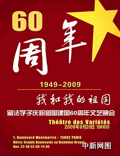 中新網(wǎng)巴黎8月30日電(尹娜)金秋十月祖國將迎來60華誕,為表現(xiàn)廣大留法學子的愛國熱情,與祖國一起歡慶華誕,全法學聯(lián)將于2009年9月20日在法國巴黎舉辦主題為“我和我的祖國”留法學子慶祝祖國建國60周年文藝晚會。