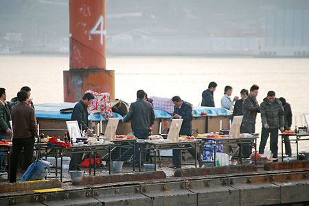 2月2日上午,中國船員家屬來到長崎漁港,登上?吭谀抢锏牡谝簧教锿瑁来螖[放好6名中國船員的彩色遺照。按照中國舟山的習俗,每幅遺照前面點燃起兩根蠟燭和3個焚香,擺放好兩束鮮花和從國內(nèi)帶來的紹興花雕酒以及親人日常喜歡吃的水果、糕點……當他們最后把一杯一杯的紹興花雕酒灑向大海的時候,當他們悲痛的哭喊聲在甲板上空回蕩的時候,所有在場的人都潸然淚下。