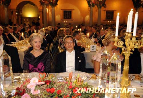 美籍華裔科學(xué)家錢永健(中)在瑞典斯德哥爾摩領(lǐng)取諾貝爾化學(xué)獎(jiǎng)后參加盛大晚宴。(新華社/法新)