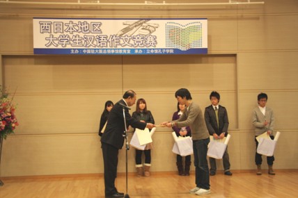 12月20日,中國駐大阪總領事館教育室在立命館大學舉行了西日本地區(qū)大學生中文作文比賽頒獎儀式。教育室主任劉占山為獲得一等獎的神戶市立外國語大學的渡部恒介同學頒發(fā)了榮譽證書和三萬元的圖書卡獎品。立命館孔子學院院長周瑋生為獲得二等獎的龍谷大學的北村籃子和關西外國語大學的增瀨有佑同學頒發(fā)了榮譽證書和一萬元的圖書卡。獲得三等獎的同學有龍谷大學的韓國留學生權純睦、神戶市外國語大學的油谷優(yōu)太、京都外國語大學相川瑞穗和神戶松蔭女子大學的古川翠。