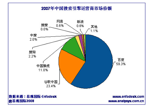 調(diào)查咨詢公司易觀國際昨天在網(wǎng)上公布的《中國搜索引擎市場年度綜合報告》顯示,2008年,百度與谷歌中國仍然占據(jù)中國搜索引擎運營商第一陣營,市場集中度進一步提高。