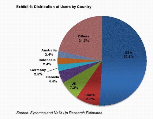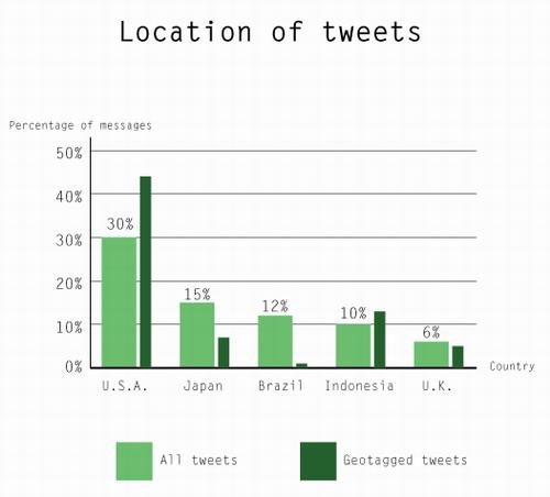 根據(jù)對(duì)一周內(nèi)所發(fā)布的1350萬(wàn)條Tweets的分析顯示,約有三分之一Twitter的用戶來(lái)自于美國(guó)。而英國(guó)作為另一個(gè)英語(yǔ)國(guó)家所擁有的Twitter用戶數(shù)量則排在第五位,僅有6%的受調(diào)查Tweets來(lái)自于法國(guó)。用戶數(shù)量排名靠前的幾個(gè)國(guó)家依次為,美國(guó)、日本、巴西、印尼以及英國(guó)。