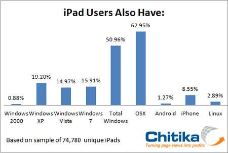 Chitika對7萬多名iPad用戶進(jìn)行了調(diào)查,結(jié)果發(fā)現(xiàn)有50.96%的用戶使用Windows系統(tǒng)。當(dāng)然,使用Mac OS系統(tǒng)的iPad用戶略占上風(fēng),比例為62.95%(部分用戶使用雙系統(tǒng))。