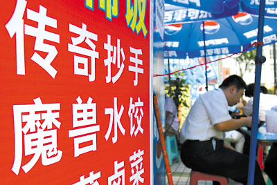 “來二兩魔獸餃子,再來一份屠龍刀!”凌晨1點,在網(wǎng)吧拼殺5個小時后吃碗餃子,已經(jīng)成了網(wǎng)友“丁丁貓”的習(xí)慣。近日,在解放碑附近,一家以網(wǎng)絡(luò)游戲以及道具名稱命名的面食店,逐漸走紅于街坊和網(wǎng)絡(luò)間。