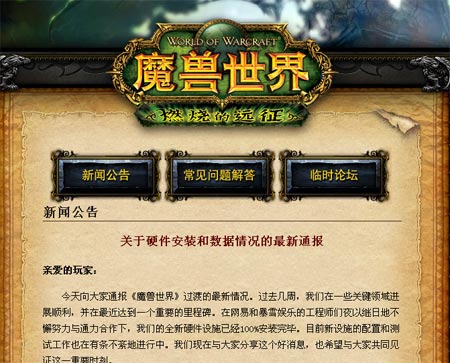 中新網(wǎng)6月24日電 今日,網(wǎng)易《魔獸世界》過渡網(wǎng)站發(fā)布最新通報(bào),稱目前《魔獸世界》全新的硬件設(shè)施已經(jīng)100%安裝完畢。