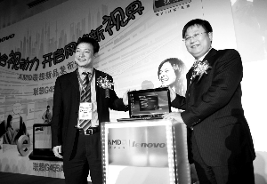 AMD首次和聯(lián)想在消費(fèi)類(lèi)筆記本電腦領(lǐng)域?qū)崿F(xiàn)了合作。昨日,聯(lián)想集團(tuán)副總裁劉杰(左)和AMD公司副總裁潘曉明(右)在京共同發(fā)布了雙方合作的第一款產(chǎn)品———聯(lián)想G455A。這是聯(lián)想筆記本產(chǎn)品首次采用了非英特爾的芯片,筆記本搭載了AMD新一代筆記本平臺(tái)“Tigris”。本報(bào)記者 王貴彬 張奕 攝影