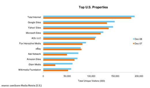 約翰·多納霍(John Donahoe)2008年一季度執(zhí)掌eBay后提倡“大幅更換產(chǎn)品、消費(fèi)方式和業(yè)務(wù)模式”,在與亞馬遜和谷歌的失敗競(jìng)爭(zhēng)中,eBay領(lǐng)導(dǎo)層徹底放棄了殘存的娛樂(lè)元素。2008年12月,eBay占網(wǎng)民網(wǎng)絡(luò)瀏覽時(shí)長(zhǎng)比率僅為1.5%。按獨(dú)立訪問(wèn)者數(shù)量排名,靠前的網(wǎng)站分別是谷歌(YouTube母公司)、福克斯互動(dòng)傳媒(MySpace母公司)等,eBay僅列第六位,與2007年12月數(shù)據(jù)相比,是十大網(wǎng)站中唯一出現(xiàn)排名下滑的網(wǎng)站。(見(jiàn)圖)