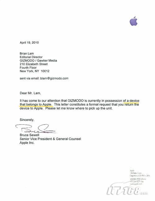 在與軟件工程師鮑威爾通過電話之后,蘋果公司首席法律顧問兼主管法律和政府事務(wù)的高級(jí)副總裁Bruce Sewell(此前是Intel的法律顧問)又給Gizmodo網(wǎng)站的編輯Brian Lam發(fā)送了一封電子郵件,信的內(nèi)容是:Gizmodo網(wǎng)站拿到的那臺(tái)iPhone屬于蘋果公司,現(xiàn)正式要求你們將其歸還給蘋果,請(qǐng)告知取回的地址。