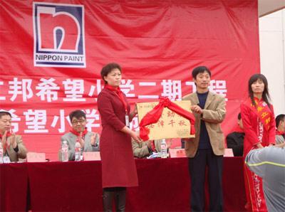 立邦(中國)有限公司再度讓一所希望小學(xué)注入彩色的夢(mèng)想。2008年10月20日,立邦公司在山西捐建的一所希望小學(xué)二期彩色希望小學(xué)工程竣工。上午九點(diǎn),在雄壯的國歌聲中,立邦太谷希望小學(xué)二期工程暨彩色希望小學(xué)落成儀式正式開始。立邦公司領(lǐng)導(dǎo)同太谷縣副縣長、太谷教育局局長及河?xùn)|鄉(xiāng)書記、希望辦的領(lǐng)導(dǎo)一起,為其揭牌并參加當(dāng)天舉行的立邦捐贈(zèng)儀式,并參觀校園文化藝術(shù)節(jié)作品、觀看師生表演。