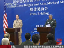 解放軍總參謀長(zhǎng)陳炳德上將11日上午與來訪的美軍參聯(lián)會(huì)主席邁克爾•馬倫海軍上將舉行會(huì)談后,共同會(huì)見了中外記者。陳炳德指出……