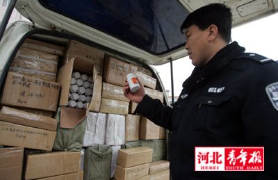 “他們稱自己是快郵公司的,幫一位貨主往石家莊郵局送貨!泵窬顕暾f,他們檢查發(fā)現(xiàn),該車?yán)氖羌耐珖鞯刂委燂L(fēng)濕、關(guān)節(jié)炎、定喘等癥狀的保健藥品。通過直觀判斷,這些藥瓶質(zhì)地粗糙,疑似假藥,兩民警立即將情況上報(bào)大隊(duì)長張紅慶。