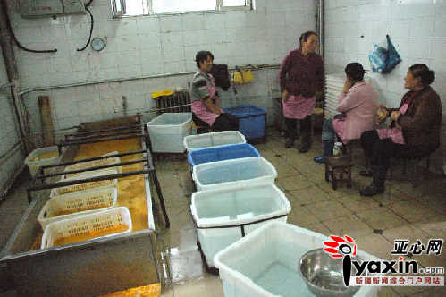 記者謊稱找老板商談合作事宜,一進大門就看到地上布滿了污水和油漬,5名洗碗工坐在小板凳上,手拿抹布在跟前的大盆子里清洗餐具。既便盆里的水已變得渾濁,洗碗工也沒有換水。