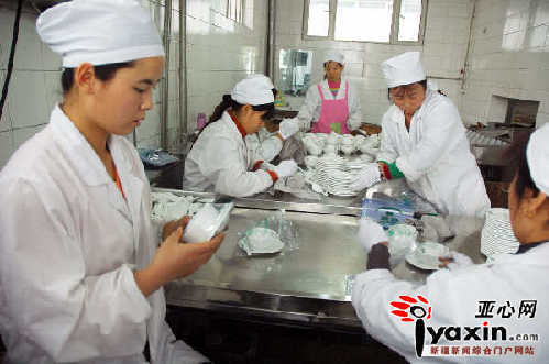 烏魯木齊市一家餐具消毒公司工作人員正在流水線包裝消毒餐具