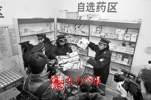 執(zhí)法人員首先趕到的診所面積不小,有4張?jiān)\療床,還分有治療區(qū)、觀(guān)察區(qū)和取藥區(qū)等,診所門(mén)口有倆雞籠,養(yǎng)著七八只雞!皬臉I(yè)人員沒(méi)有行醫(yī)證,診所沒(méi)有‘執(zhí)業(yè)許可證’!苯鹚畢^(qū)衛(wèi)生監(jiān)督所所長(zhǎng)張汴生說(shuō),“這里面所有器械都沒(méi)消毒,還喂著雞,真是太不衛(wèi)生了!贝送猓谶@家診所收繳的藥品1/3都是過(guò)期的。記者隨手拿起一盒頭孢拉定膠囊,上面的有效日期截至2006年12月。