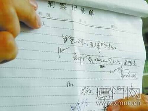 1日下午,在市內(nèi)某大醫(yī)院的兒科候診區(qū),記者隨手向一名帶孩子前來(lái)復(fù)診的家長(zhǎng)借了份病歷,一看就懵了:除了“09.2.1”的日期和表示藥物劑量的幾個(gè)阿拉伯?dāng)?shù)字能看清,其他字跡根本無(wú)法辨認(rèn)!搬t(yī)生寫(xiě)字都是這樣!边@位家長(zhǎng)說(shuō),他從來(lái)就不去看病歷,看了也看不懂。