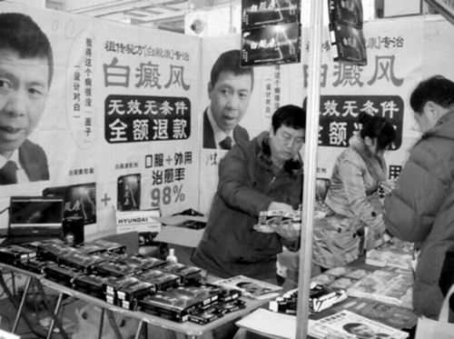 這位工作人員說,一旦馮小剛把他們告了,他們沒錢賠給馮小剛,就有機會讓馮小剛使用他們的藥,治療白癜風。這家藥品企業(yè)的做法也的確產生了效果,不少人圍著展臺,“馮小剛給代言的啊?”“馮小剛有白癜風?”