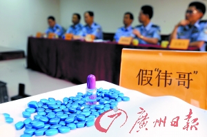 昨日,記者在發(fā)布會現(xiàn)場看到了一箱箱被查獲的假冒“萬艾可”(俗稱偉哥),這些“偉哥”的外包裝精美,但將藍色的藥丸拿在手中,便發(fā)現(xiàn)質(zhì)量很差,藥衣很容易掉色。