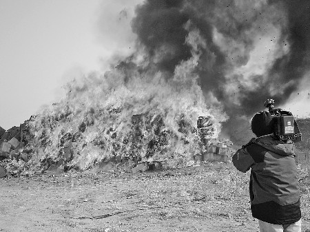 偽劣藥械堆成小山在烈火中化為灰燼