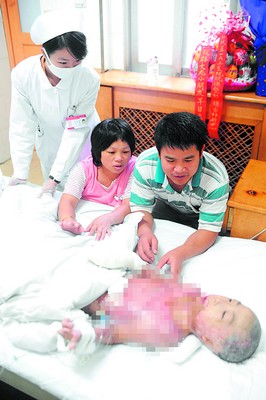 醫(yī)生告訴雷麗娟,孩子75%面積燒傷,無法痊愈,“你們花100萬也治不好,就算治好也有可能落下殘疾!崩惥耆套⌒闹械谋,撫摸著文龍身上重重包裹的白紗布說:“不管你變成什么樣,永遠(yuǎn)都是媽媽的寶貝!就算上街乞討,也要把你治好!”第二天,雷麗娟和丈夫帶著孩子先后來到長沙的4所醫(yī)院,但求醫(yī)未果。今年8月中旬,經(jīng)人介紹,孩子被送進(jìn)解放軍163醫(yī)院燒傷整形·頜面外科中心,醫(yī)生確診其為“全身燒傷后疤痕攣縮畸形”。