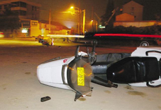 記者當晚趕到現(xiàn)場時,潘女士已去醫(yī)院就診,一名腿部受傷的男子正坐在路邊休息。只見地上躺著一輛電動車和一輛摩托車,電動車旁邊已被接警前來的派出所民警放置了一個警示標志,民警同時還將警燈打開,提醒過往的電動車和摩托車減速行駛。