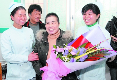 3月2日上午,已將一頭長(zhǎng)卷發(fā)剪成寸頭的吳澤連由丈夫陪著坐在病床前的凳子上。此時(shí)的她滿面笑容,臉上還帶著一絲紅潤(rùn)。入院66天來(lái),在眾多親友都認(rèn)為“沒(méi)得救了”的情況下,她硬是從“鬼門關(guān)”被拉了回來(lái)。