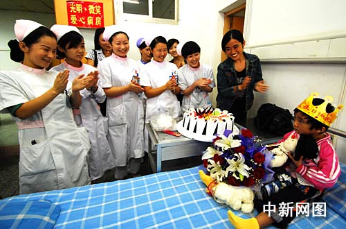 “祝你生日快樂, 祝你生日快樂”, 9月28日上午9時許,從江西九江學院附屬醫(yī)院住院部八樓的光明.微笑愛心病房里傳出歡快的生日祝福歌,醫(yī)護人員正在給小患者小胡慶祝生日。