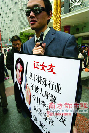 墨鏡、領帶、藍灰西服,一手拿把玩具左輪手槍,一手舉個紙牌站在深圳市華強北對看客頻頻點頭致意。昨日,深圳一男子自稱在成人用品行業(yè)工作,找不到女友,特意打扮成這個“007造型”,舉牌征女友。