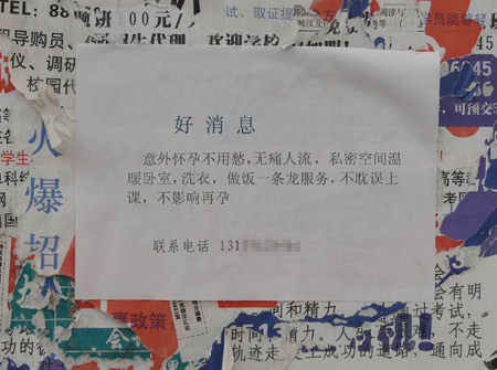 近日記者走進(jìn)某高校,在一個(gè)靠近圍墻的廣告欄上,不起眼的角落里貼著一張小廣告,上面寫著“無痛人流一條龍服務(wù),不影響上課……”