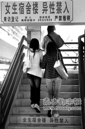 下午4點,記者在其中一棟男生樓進行了觀察。30分鐘內(nèi)共有5名女生,從沒設門崗的出入口進入男生樓。1個手提快餐,準備上樓的女孩告訴記者,她常常到男生宿舍玩,“4年來好像只登記過1次,管理員極少上門檢查”。