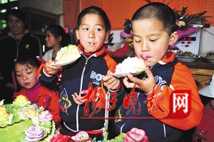 踩過“步步糕”和“子孫蛋”后,儀式最重要的部分開始了。當年的主刀醫(yī)生、南京市兒童醫(yī)院新生兒外科徐小群主任醫(yī)師和護士長夏娟各剪斷了一條尾巴,并送上了禮物——兩個書包。一下子見到那么多生人,兩個孩子似乎有點不太適應,連平日里一向活潑的蘇寧也變得沉默寡言起來。只有在吹完蠟燭吃蛋糕時,兩個孩子才放松下來,丟下手中的叉子直接啃起了蛋糕。