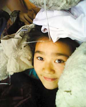 【當(dāng)初】:這個(gè)女孩被埋在一片廢墟中,輸液的管子懸在她的頭頂。然而,她那清秀的臉上露出的竟是甜甜的微笑。她叫高瑩,都江堰聚源中學(xué)初三學(xué)生。在廢墟中被埋20個(gè)小時(shí)后,她被從廢墟中挖出來了,雙腿都斷了,雙手也被砸傷,可她從被挖出來到救助站都沒哭,在大家挪動(dòng)她的時(shí)候,她也只是咬了咬嘴唇。這個(gè)女孩還一邊微笑,一邊對(duì)大家說:“要勇敢!”