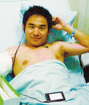 21日凌晨麻醉劑的藥效過去后,廖波疼痛難忍,為了不影響同室兩名病友休息,他咬著毛巾和筷子堅(jiān)持著,最后把一雙筷子都咬斷了也沒呻吟一聲。目前,他的病情已趨于穩(wěn)定,但可能還需要再次手術(shù)。住院期間,廖波還認(rèn)了一名志愿者做干媽!八龑(duì)我特別好,是第一個(gè)幫我擦身子、換衣服的人!绷尾ê俺觥皨尅钡臅r(shí)候,志愿者頓時(shí)泣不成聲,把廖波擁在了懷里。