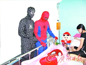 昨日上午9時(shí)30分許,在汕頭大學(xué)第一附屬醫(yī)院北樓三層的兒科病房的走廊上,突然出現(xiàn)了兩個(gè)與周圍環(huán)境不太相襯的角色,立刻引起了一陣不小的轟動(dòng)!皟蓚(gè)男的,一個(gè)穿紅衣服,一個(gè)穿黑衣服,都蒙著臉!眱嚎撇》42床上的小患者母親黃海璇回憶當(dāng)時(shí)的情景,這兩個(gè)人的裝扮就和電影里的“蜘蛛俠”一模一樣,徑直來(lái)到了她眼前,然后把蜘蛛俠玩具放到了病床上。