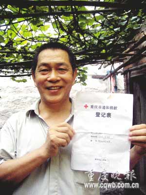 蔣必忠的愿望在7月24日這天變成了現(xiàn)實。那天下午,當(dāng)他躺在病床上,用顫抖的右手在那張《重慶市遺體捐獻(xiàn)登記表》上歪歪斜斜簽下自己的名字后,他長長地舒了口氣。就這樣,這個59歲的直腸癌晚期患者,成為在北碚區(qū)紅十字會登記的首個農(nóng)民遺體捐獻(xiàn)者。