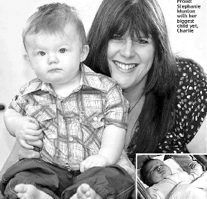 英國(guó)西約克郡彭特弗萊克市41歲女教師斯蒂芬妮·蒙頓16年前生下第一個(gè)女兒安布時(shí),她以為自己生下了一個(gè)“巨嬰”,因?yàn)榘膊忌聛砭怪剡_(dá)9.6斤。然而令斯蒂芬妮做夢(mèng)也沒想到的是,她又接連生下了另外3個(gè)兒女,并且這些孩子就像暗暗較勁一樣,出生時(shí)一個(gè)比一個(gè)重,斯蒂芬妮最小的孩子、如今7個(gè)月大的查利出生時(shí)竟重達(dá)12斤!斯蒂芬妮發(fā)誓以后再也不敢懷孕了,因?yàn)樗裏o法想象如果自己再生第5個(gè)孩子,這個(gè)孩子的體重將會(huì)多驚人。
