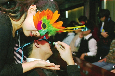 參加者都用眼罩蒙住眼睛,再戴上面具。然后,屋里關(guān)燈,每個人仔細(xì)甄別異性散發(fā)出來的氣味。如果女士找到屬于自己味道的男士,就可以輕拍他三下,邀請其參加接下來的活動。雙方蒙眼參加“心有靈犀”、“危情應(yīng)對”等一系列的活動之后,選定情侶并將定情鎖送給對方作為信物。