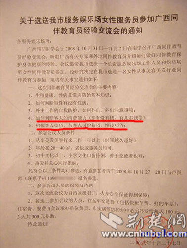 通過(guò)“糜瑞蘭”上傳的宣傳單照片,可以很清楚的看到這份全稱為《關(guān)于選送我市服務(wù)娛樂(lè)場(chǎng)女性服務(wù)員參加廣西同伴教育員經(jīng)驗(yàn)交流會(huì)的通知》的宣傳單中,抬頭為“各服務(wù)娛樂(lè)場(chǎng)所”,落款為“宜州市疾病預(yù)防控制中心”并蓋有相應(yīng)公章,其正文中列明交流會(huì)的主要內(nèi)容包括“……4、如何判斷客人的消費(fèi)能力……5、招攬客人技巧,與客人討價(jià)技巧,性技巧等”。該圖文內(nèi)容隨即被多個(gè)論壇轉(zhuǎn)載。