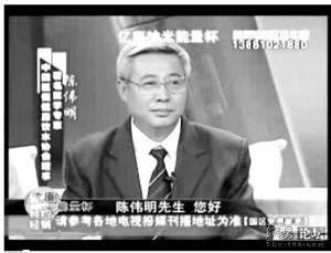 在一家電視臺(tái)播出的億康納米能量杯的廣告中,一位學(xué)者打扮的人端坐當(dāng)中,文字顯示,他叫陳偉明,是中國(guó)醫(yī)促健康飲水協(xié)會(huì)理事。而在另一幅華佗延壽酒的廣告視頻截圖中,還是那位“陳偉明”,可文字顯示其姓名卻變成了關(guān)新良,身份也變成了《北京中醫(yī)》雜志編委、中國(guó)中西醫(yī)結(jié)合協(xié)會(huì)理事、北京中日友好醫(yī)院主任醫(yī)師。第三幅截圖來自天地磁療儀的電視廣告,這個(gè)“陳偉明”又成了一名心臟病患者,一臉痛苦表情。