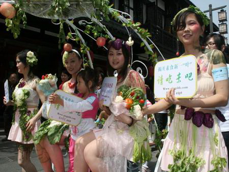 當(dāng)天正值第四十個世界地球日,成都文殊坊街上人流熙攘。這幫身披菜葉的年輕漂亮女子馬上就成為行人注目的焦點(diǎn),“喲,遠(yuǎn)看就只掛了些菜葉子在身上,原來還是穿了點(diǎn)紗的嘛,是不是又在搞什么商業(yè)活動哦?”四川新聞網(wǎng)記者在現(xiàn)場看到,雖然沒怎么搞清楚狀況,但不少市民已經(jīng)掏出手機(jī)來開始拍照。得知是群素食主義者的宣傳活動后不少市民都打趣稱,“用穿得少的美女上街當(dāng)噱頭,肯定要轟動!
