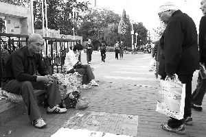 昨日下午,陳松發(fā)在人民大學(xué)東門旁的便道上乞討,一名過路的女士掏出420元錢塞進陳松發(fā)手中,頭也不回地走了。陳松發(fā)的弟弟趕緊追了上去。