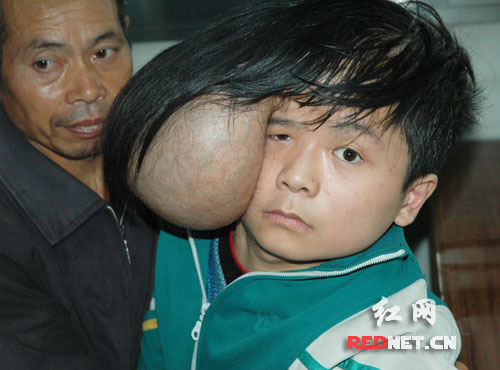這名不幸的“雙頭”少年名叫梁樂,來自湖南耒陽。梁樂的父親梁某介紹,這個病兒子已經(jīng)患了10多年之久。“兒子小的時候頭很大,醫(yī)生檢查為腦積水,后來在衡陽一所醫(yī)院開了刀!绷耗痴f,過了一兩年兒子頭上突然長了個雞蛋大的“瘤子”,之后,隨著年歲增長,“瘤子”越來越大,到現(xiàn)在都長得有一個頭那么大了。由于兩個“頭”負擔太重,梁樂連站都站不穩(wěn),必須要父母親背著,每天晚上睡覺也只能仰著睡。