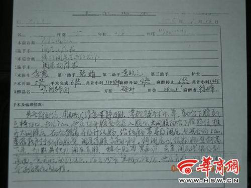 6月26日,張女士再次來到西安市第四醫(yī)院,復(fù)印出當(dāng)時(shí)的住院病案,病案顯示3年前的那個(gè)手術(shù)共進(jìn)行了110分鐘,并在醫(yī)院當(dāng)時(shí)的手術(shù)記錄里,主治醫(yī)師李震在“手術(shù)及病理情況”一欄,用手寫體如此描述了當(dāng)時(shí)的手術(shù)情況:“患者仰臥位……沿結(jié)腸帶尋及闌尾,見其長約五厘米,萎縮粘附于結(jié)腸腸壁,闌尾系膜高度水腫。將闌尾從結(jié)腸腸壁剝離下來,切斷并結(jié)扎闌尾系膜……切除之標(biāo)本家屬看后送病檢。”