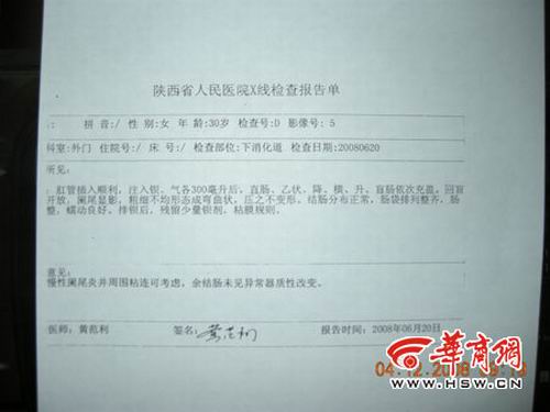 2005年9月12日上午,張女士因慢性闌尾炎急性發(fā)作住進(jìn)了西安市第四醫(yī)院,并于當(dāng)天下午進(jìn)行了闌尾切除手術(shù)。 2008年5月,張女士和丈夫打算要個(gè)孩子,于是在省婦幼保健院做了相應(yīng)檢查,醫(yī)生認(rèn)為張女士腹部的反復(fù)疼痛將影響日后的正常妊娠,建議查明疼痛病因并徹底治愈后再行懷孕。于是,6月份她來到陜西省人民醫(yī)院進(jìn)行病因檢查,另她意想不到的是,省人民醫(yī)院出具的X射線檢查報(bào)告顯示,疼痛系闌尾發(fā)炎引起。為證實(shí)這一令人窒息的結(jié)果,她又在第四軍醫(yī)大學(xué)進(jìn)行復(fù)查,并經(jīng)多名專家會(huì)診,得出與省人民醫(yī)院完全相同的結(jié)論——闌尾未被切除。