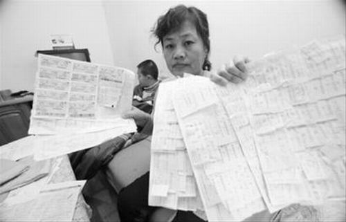 為給明明治病,一家人四處奔波,攢下一堆票據(jù)。 記者 樸峰 攝