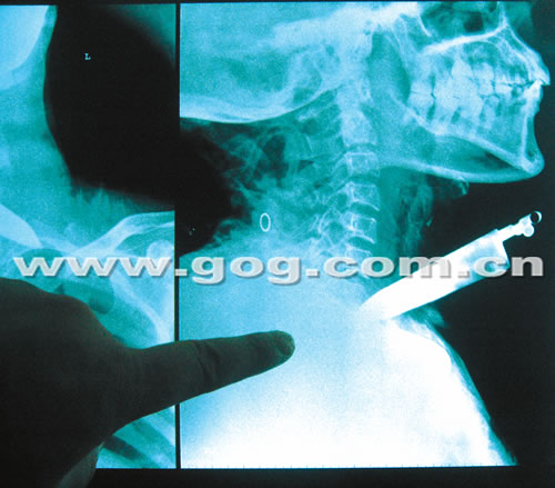貴醫(yī)附院耳鼻喉科主治醫(yī)生王曉云告訴記者,老人被送到醫(yī)院時,喉嚨上插著一把水果刀,進(jìn)入喉嚨的刀鋒部分大約有6.5公分。王曉云說:“經(jīng)檢查,老人頸部和肺尖受傷,生命垂危。由于水果刀可能傷到大動脈,手術(shù)有風(fēng)險,要求家屬簽字,但老人一直不透露家人的信息,我們醫(yī)院也很為難。”